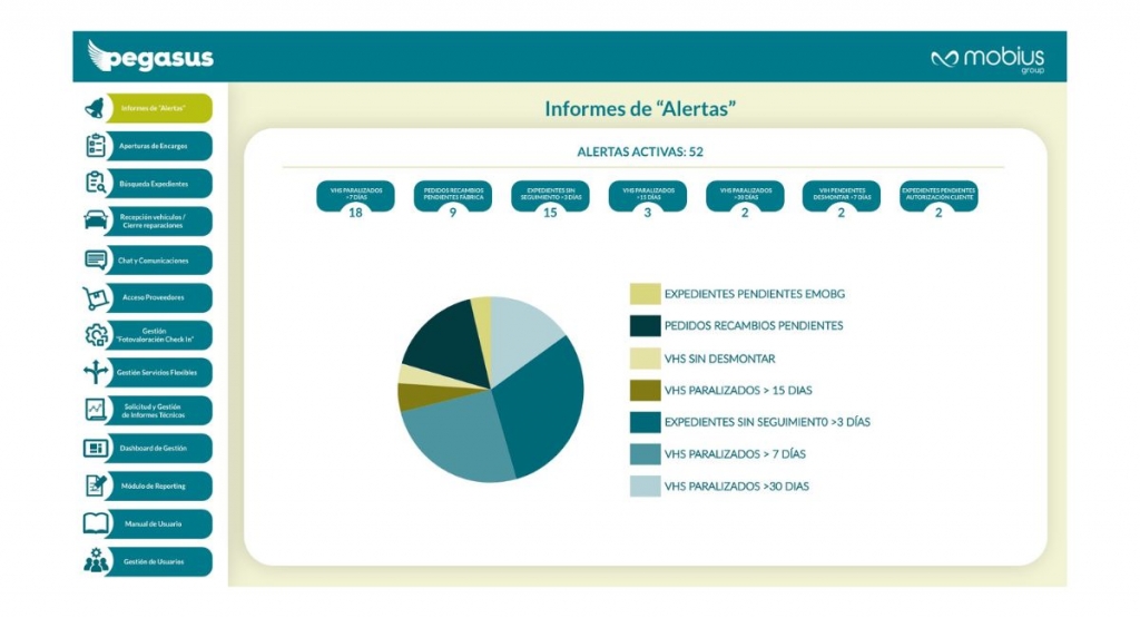 Pegasus cuenta con el expertise técnico y tecnológico de Mobius Group para la gestión eficiente de expedientes de reparación, mantenimiento y siniestros de vehículos y de comunicación con los profesionales que intervienen: peritos, talleres, recambistas, responsables de flotas y conductores.
