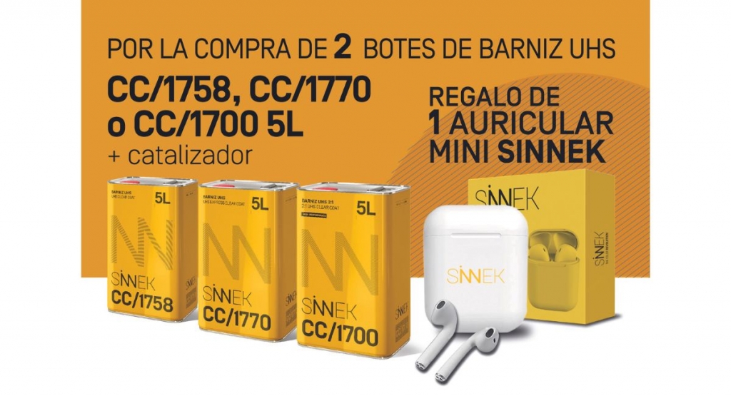 SINNEK lanza una nueva promoción dirigida a premiar la fidelidad de sus clientes con unos modernos auriculares mini de tecnología bluetooth, gracias a cada compra de 2 botes de 5 litros de barniz UHS de las referencias CC/1700, CC/1770 o CC/1758, más sus respectivos catalizadores. La promoción permanecerá vigente hasta el próximo 2 de junio.